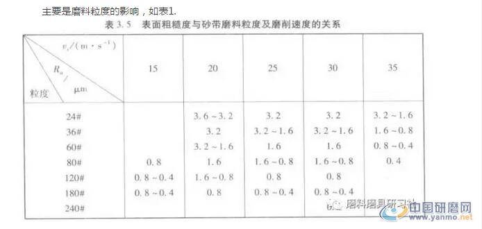 砂帶基材的柔性對粗糙度也有影響。柔性越大的砂帶所達(dá)到粗糙度越低。用動物膠黏劑的砂帶所加工的Ra值比合成樹脂粘劑砂帶加工的小。砂帶接頭增厚和變硬也會使粗糙度增大。所以精細(xì)拋光時選用柔軟平整、厚度均勻的砂帶為好。